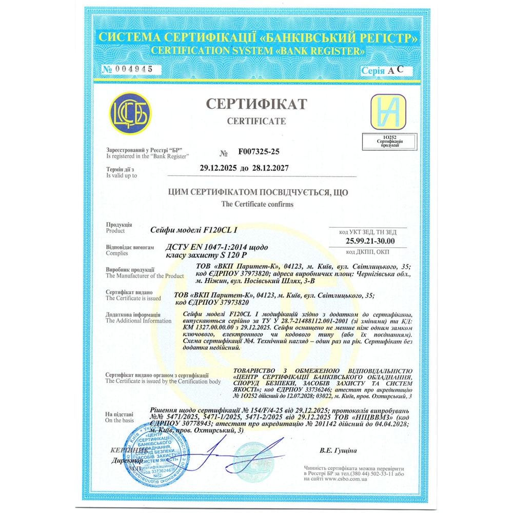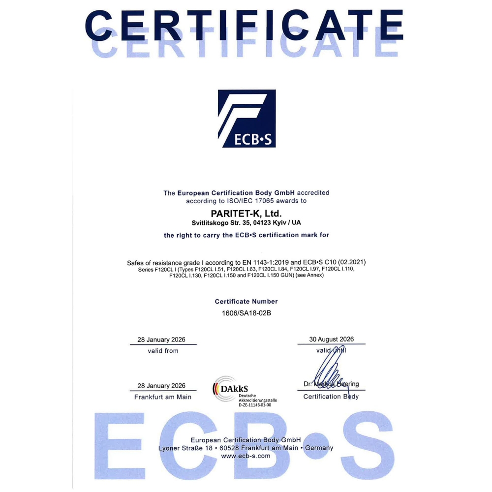 Серия F120CL I сертифицирована по I классу взломостойкости (ДСТУ EN 1143-1) европейским органом ECB-S (Германия).